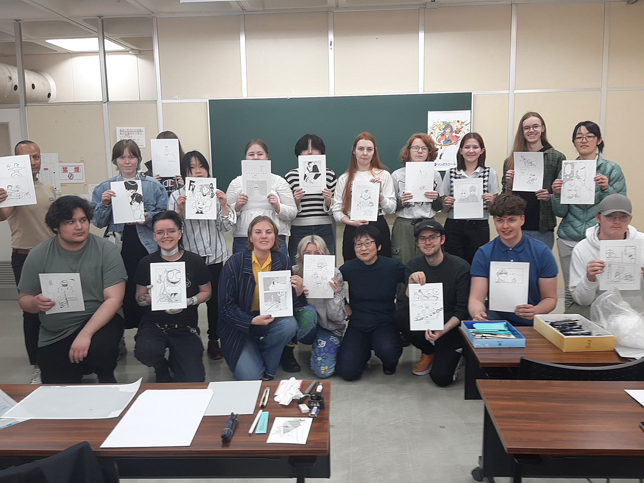 We will use a relatively easy example of four-panel manga, “Essay Manga.” After lectures using real examples to show how students how they can draw upon daily life for four-panel manga material, and how to shape that into four parts with exposition, development turn and conclusion, they will then begin to draw. We will finish with inking, tone work/coloring.